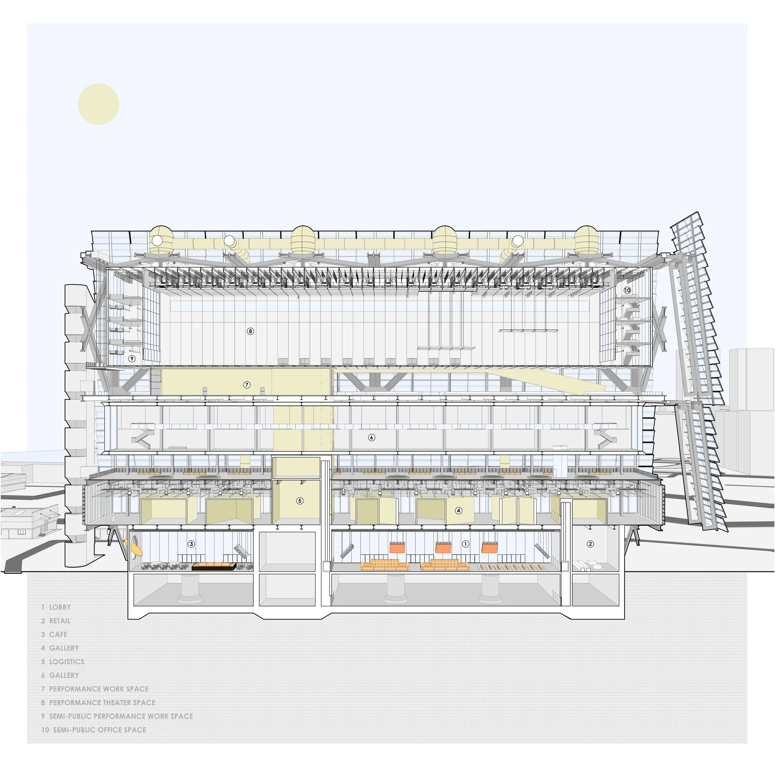 CROWNING THE BUILDING IS LEVEL 6, A FULLY GLAZED PERFORMANCE BOX EQUIPPED WITH MOVABLE PLATFORMS. THIS LEVEL ENABLES A WIDE RANGE OF PERFORMANCE FORMATS, FROM CONVENTIONAL STAGE PRODUCTIONS TO EXPERIMENTAL, IMMERSIVE THEATER. THE TRANSLUCENT FROSTED GLAZING CREATES A SOFT, DIFFUSED LIGHT INSIDE WHILE OBSCURING DIRECT VIEWS, TURNING THE PERFORMANCE INTO A SILHOUETTED SPECTACLE AGAINST THE SKY. THE EFFECT MAINTAINS PRIVACY FOR PERFORMERS WHILE STILL ANNOUNCING THE PRESENCE OF ACTIVITY TO THE SURROUNDING CITYSCAPE.