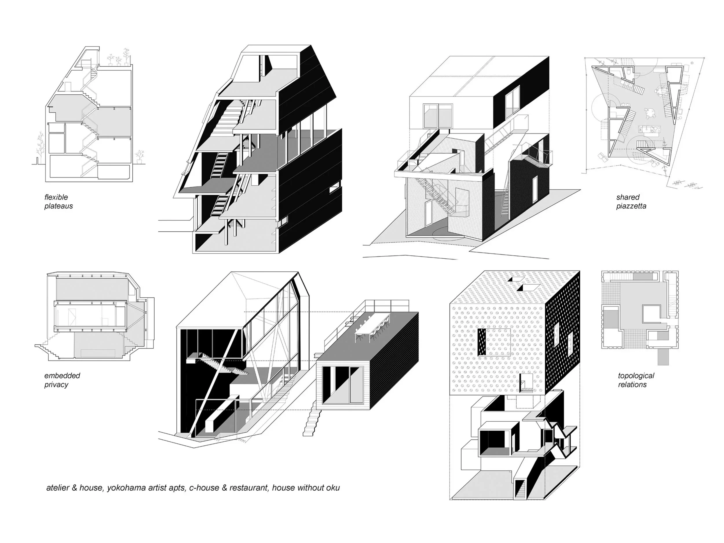 In response to this, a series of architectural proposals are investigated that test organizational and formal strategies for hybridizing co-living and co-working programs at the middle scale between house and housing. Developed as four morphologies— clustering, nesting, pooling and looping —each scheme is designed to produce a particular character on one hand (topological relations of space), and on the other encourage scenarios for social interaction (programmatic adjacencies, mixes and separations). For example, pooling organizes degrees of public-to-private access through a sectional landscape, whereas clustering distributes a constellation of personal capsules with gradients of shared space in between.